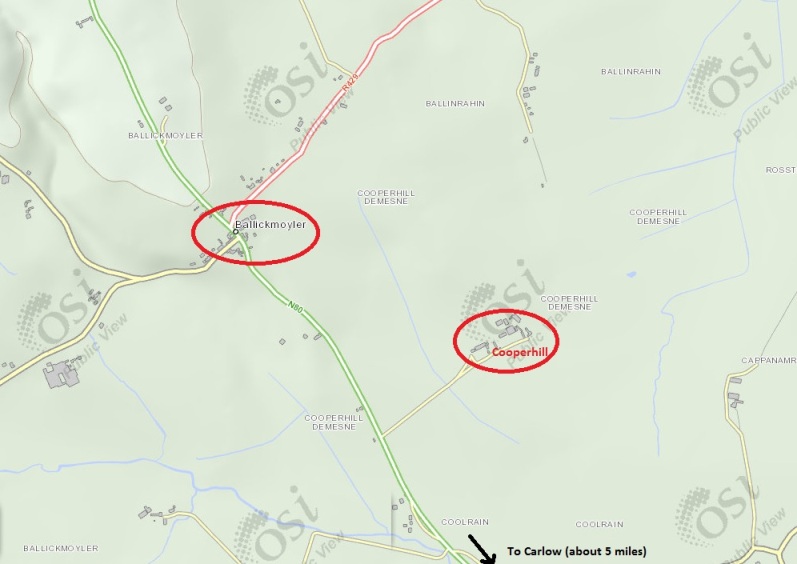 Cooper Hill Demesne, on Cooper Hill about 1 mile southeast of Ballickmoyler