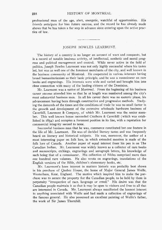 From Who’s Who in Canada Joseph Bowles Learmont, merchantSon late Wm. and Eliza (Bowles) Learmont; b. and e. Montreal; m. 1st Amelia Jane (d. 1875), daug. late Hon. L. H. Holton, M. P., a prominent parliamentarian and statesman; 2ndly, Charlotte (prominently identified with the movement for providing playgrounds for children, a director City Improvement League, one of the promoters of the Royal Edward Institute and is V.-P. of the Montreal Tuberculosis Association, V.-P. Y.W.C.A., treasurer Nat’l. Council of Women, pres. Montreal Day Nursery, pres. local branch Needlework Guild, pres. and convener local branch Victorian Order of Nurses etc.; was one of a deputation, headed by the Countess of Aberdeen, who presented to Queen Mary an address of congratulation from 25,000 women of Canada upon her accession to the throne) daug. late Chas. F. Smithers, pres. Bank of Montreal; has run a successful career as a business man; at present is the senior member of the firm of Caverhill, Learmont & Co., wholesale hardware merchants, Montreal (est. 1854); noted for his literary tastes, and has frequently lectured on literary and historical subjects; an early member of Numismatic and Antiques Society; a collector of rare books and manuscripts, etchings, engravings, autograph letters, etc.; among other offices held by him are the following: member Committee of Management Montreal General Hospital; mem. Montreal Board of Trade (2 years a councilor); mem. Board and a governor Victorian Order of Nurses (Montreal Branch); director Charity Organization Society; mem. Executive committee Lord’s Day Alliance, treasurer Montreal Art Association and councilor and treasurer local branch of the Archaeological Institute of America; author of paper on “Folk-lore” including Canadian folk-lore, and of another paper on “The Canadian Indian”; a Cong. – 30 Macgregor St., Montreal; St. James Club; Mt. Royal Club; Montreal Club; City Club. “A man of deep knowledge on special subjects, and of exquisite taste.” – Dr. John Reade.