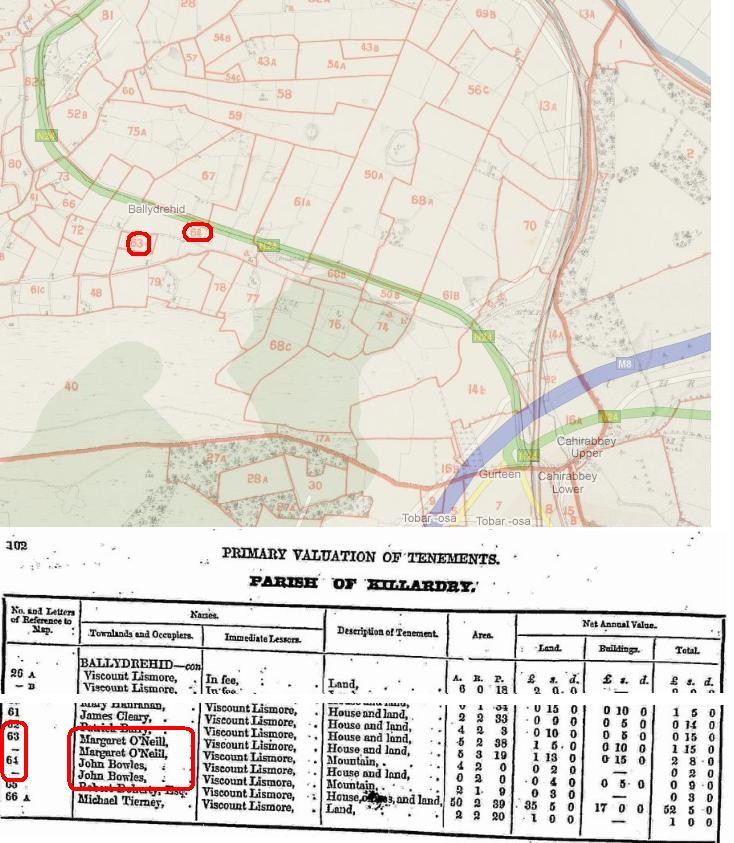 John Bowles of BallydrehidGriffiths Valuation of Tipperary from 1851 lists a Margaret O'Neill at Ballydrehid just on the NW outskirts of Cahir. Within her lot is a small house and yard held by a John Bowles. They are both holding their land under leases from Viscount Lismore. I believe this to be the John Boles who died in 1856 at age 70 and is buried in the cemetery in Clonmel. I also believe that he was the father of Robert Boles of Cahir who married a Margaret O'Neill in 1835. Robert had done contract work on Lismore Castle and acquired his property in Cahir in 1857 shortly after John Bowles death possibly after having received an inheritance. My visit to John Bowles' land in January 2011