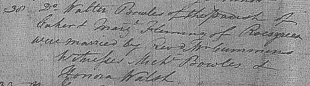 Robert Boles of CahirOne Boles family arrived in Cahir early in the 1800's and is still there today. Robert Boles, who I believe to have been the son of John Bowles above and also to have been of the Bowles of Clonmel line, settled in Cahir before 1833, married a Margaret O'Neill in 1835 and established himself as a successful building contractor with major projects in Cahir, Clonmel and Cashel. He also opened a grocers shop on The Square in Cahir which was family-run until 1983. The building is still in the Boles family today. For an account of his life as has been passed down through three more generations of Robert Boles', please see Robert Boles Story as recounted by his great-grandson, Bob Boles of Dublin The 1889 Directory of County Tipperary, lists the only Boles in all of Tipperary as: Miss K Boles, Grocer, The Square, Cahir Robert Boles, Builders, The Square, Cahir (these are Robert Sr.'s children: Catherine and Robert Boles) See also Robert Boles of Cahir's Family TreeWalter Bowles of Cahir(under construction) Walter Bowles b. ~ 1815 probably Tipperary (parents not known) m. Margaret Flemming of Roesgreen (b. ~ 1812) March 2, 1835 Cahir parish (RC)