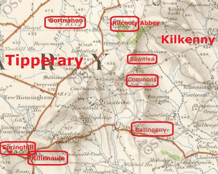 The second branch, The Bowles of The Commons, which is about 1 mile south of Bawnlea, emigrated to Quebec. For their story see The John Bowles Family of Valcartier, Quebec. Another Bowles family from The Commons moved to Ballingarry, co. Tipperary and then on to Oola, co. Limerick which provides us with a clue which may yet lead to Oola as the origin of the Bowles of Kilcooly. See The Connection Between The Bowles of Kilcooly and The Bowles of Oola, Limerick. While it was initially denied by the descendants of both branches in
