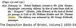 One of Charles II's first steps after his return was to levy a poll-tax on his citizens in order to refill his depleted Treasury. This was done for Ireland by a Poll-Money Ordinance in 1660 and again in 1661. This ordinance levied a tax on every landholder in Ireland and appointed a new set of Commissioners to collect the tax and to forward it on to Arthur Annesley, Esq. as the new Deputy Treasurer of Ireland who had replaced Thomas in 1660. The Poll-Money Ordinance of 1660 lists the commissioners appointed for the various counties. The list of commissioners for Wicklow includes only 26 names including a Thomas Bolles. The list of Commissioners authorized to collect the poll-tax in Wicklow in 1661 includes 35 names including a Thomas Bowls. In the 17th century little attention was paid to the correct spelling of surnames. There are many other spelling variations between the 1660/1661 lists such as Cromwell Winkfield/Cromwel Wigfield (Wingfield would be correct), John Humfreys/John Humphreys, Richard Bulkley/Richard Buckley etc. so a Commissioner recorded as Thomas Bolles or Bowls in Wicklow would still be our Thomas Bowles. This would have been some of the land awarded to him after Parliament's ruling in 1656 that he should be awarded land as compensation for his service.
