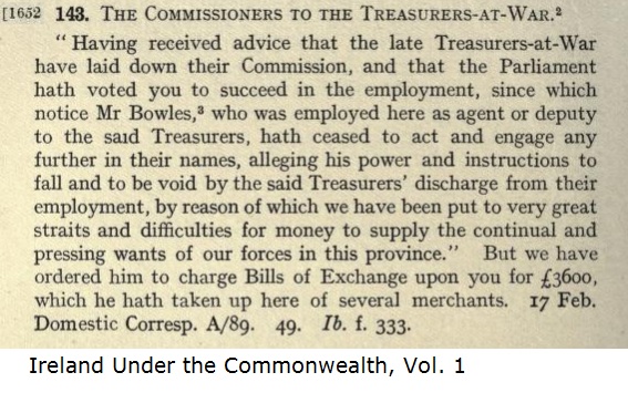 Thomas Bowles, Deputy Treasurer of Parliament's Army in Ireland Back to The Bowles of DublinSee also The Thomas Bowles of Dublin Family Tree Thomas Bowles arrived in Ireland with the English Parliament's invasion of Ireland in 1649 which was led by Oliver Cromwell. Likely he arrived with the smaller army of administrators that followed the fighting forces to set up the new government but he may actually have served in Cromwell's army as one reference refers to him as Captain Boules. Bowles or Boules?The earliest original sources give Thomas' surname as Bolds, Boulds or Boules. Only the transcribed records, mostly made in the late 1800's, show him as Bowles but that may have been based on the transcriber's knowledge that Thomas' children and subsequent generations were generally recorded as Bowles. Alternatively his family may genuinely have used the Bowles spelling even before he came to Ireland where the Bowles name was unknown but where the Bould name was. In this period very little attention was paid to the correct spelling of surnames and frequently clerks tended to write down whatever they thought a name sounded like. In balance though I think it more likely that the Bowles spelling was correct and the clerks had made the errors. For a more detailed look of this question see Captain Thomas Boulds or Bowles of DublinFor Now - BowlesHis parents are unknown so far but, based on the common practice for naming children in that period (eldest son after father's father, eldest daughter after mother's mother, second son after mother's father, second daughter after father's mother although the tradition for the daughter's names was not as strictly adhered to) they were possibly a Thomas and Hester Bowles of somewhere in England.The Deputy Treasurer-at-War for Ireland During England's Civil War![]() ![]() ![]() The problem seems to have been that only Treasurer Wollaston and his Deputy Blackwell had originally been appointed by Parliament. Thomas had then been appointed by Wollaston as his Deputy for Ireland. However, with Wollaston discharged and Blackwell and Leman appointed to replace him, Thomas was unsure of his position. Finally in July 1653 Parliament formally appointed Blackwell and Richard Deane as joint Treasurers-at-War, created the positions of Deputy Treasurers for Scotland and for Ireland, specified their salaries and a budget was set under which the office was going to be run (see the Bill at the bottom of this page). While Thomas appears to have not been too happy with working for Blackwell in 1652, a few years later there was another connection between the Blackwell and Bowles families in England when John Blackwell's niece Anne married another Thomas Bowles at St James Duke's Place, London in 1681. As we have not yet traced this Thomas back to his family in England I don't know whether that was the same Bowles line. See The Blackwell Family Tree Needing money to pay their troops and seeking to gain the greatest possible advantage from their occupation of Ireland an act was passed in Sept. 1653 for "the satisfaction of Adventurers in Ireland and arrears due to soldiery there and other debts and for the encouragement of Protestants to plant and inhabit Ireland." In return for their financial support, English investors were allocated lands in Ireland which had been seized from the Catholic Irish and Old English landholders who had originally rebelled against the King and then had resisted Parliament. According to C. H. Firth, the Treasurers-at-War in England were able to send £1,491,580 to Ireland and a further £1,942,548 was raised in Ireland itself between July 1649 and November 1656. ref. All of that would have had to pass through Thomas Bowles for distribution. Despite that huge responsibility he was still in just a salaried position with no right to participate in the massive land grab which he was helping to administer. ![]() On Dec. 4, 1656 the Lord Deputy and Council of Ireland petitioned Parliament on Thomas Bowles' behalf to compensate 'those commissioners appointed by Act of Parliament to state the accounts of the army in Ireland ... for satisfying their arrears in land ... for their good service." On that same day the Protector and Council ruled that the three petitioners should be paid their arrears by "Lands given them to be given as they are given to officers and soldiers." He appears to also have established himself in business as in May 1655 he was one of the residents of Dublin who petitioned Parliament to end customs duties between Ireland and England. (Ireland Under the Commonwealth by Robert Dunlop, Vol. I) In 1656 Thomas (as Boles this time) and his brother-in-law, Walter Plunkett, were appointed Commissioners for the Assessing, Levying and Collecting the assessment (a tax) in the city and county of Dublin. ![]() ![]() The Bowles and the PlunkettsNote: the name Plunkett appears sometimes with one 't' and sometimes with two, apparently randomly during this period. Shortly after these events a general guideline developed, but was often ignored, that a Plunket was a Protestant while a Plunkett was a Catholic. I have used Plunkett generally on this family history page as most of my research sources have used Plunkett. I've used Plunket on their family tree page as I've attempted to trace only Walter Plunket's Protestant line. Around 1650/51 Thomas married Mary Plunkett, the sister of Walter Plunkett of Rathbeale, co. Dublin. Cromwell arrived at Dublin with his troops in August 1649 so if Thomas arrived as a stranger shortly after that his marriage must have proceeded rather quickly as their first born was baptized in April 1652. She was a brilliant choice as his wife. The Plunketts were a mostly Catholic old-Irish family who were leaders of the 1641 Irish Rebellion which had taken back much of Ireland from the British and they had been leaders of the provisional government of Ireland, the Kilkenny Confederation, since 1642. They are sometimes stated to be of